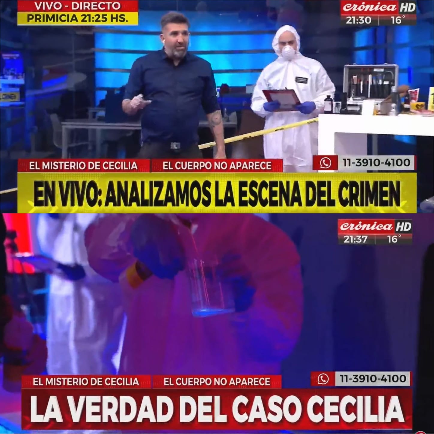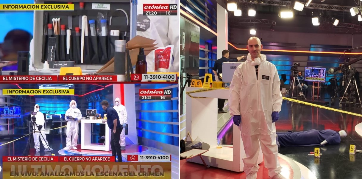 Durante junio de 2023 participamos en el programa de TV «Crónica Central», conducido por Diego Moranzoni. Con motivo al caso Cecilia, realizamos la recreación del relevamiento de una escena del hecho, utilizando nuestros maletines y productos, y haciendo hincapié en el revelado y levantamiento de indicios biológicos y manchas hemáticas lavadas.