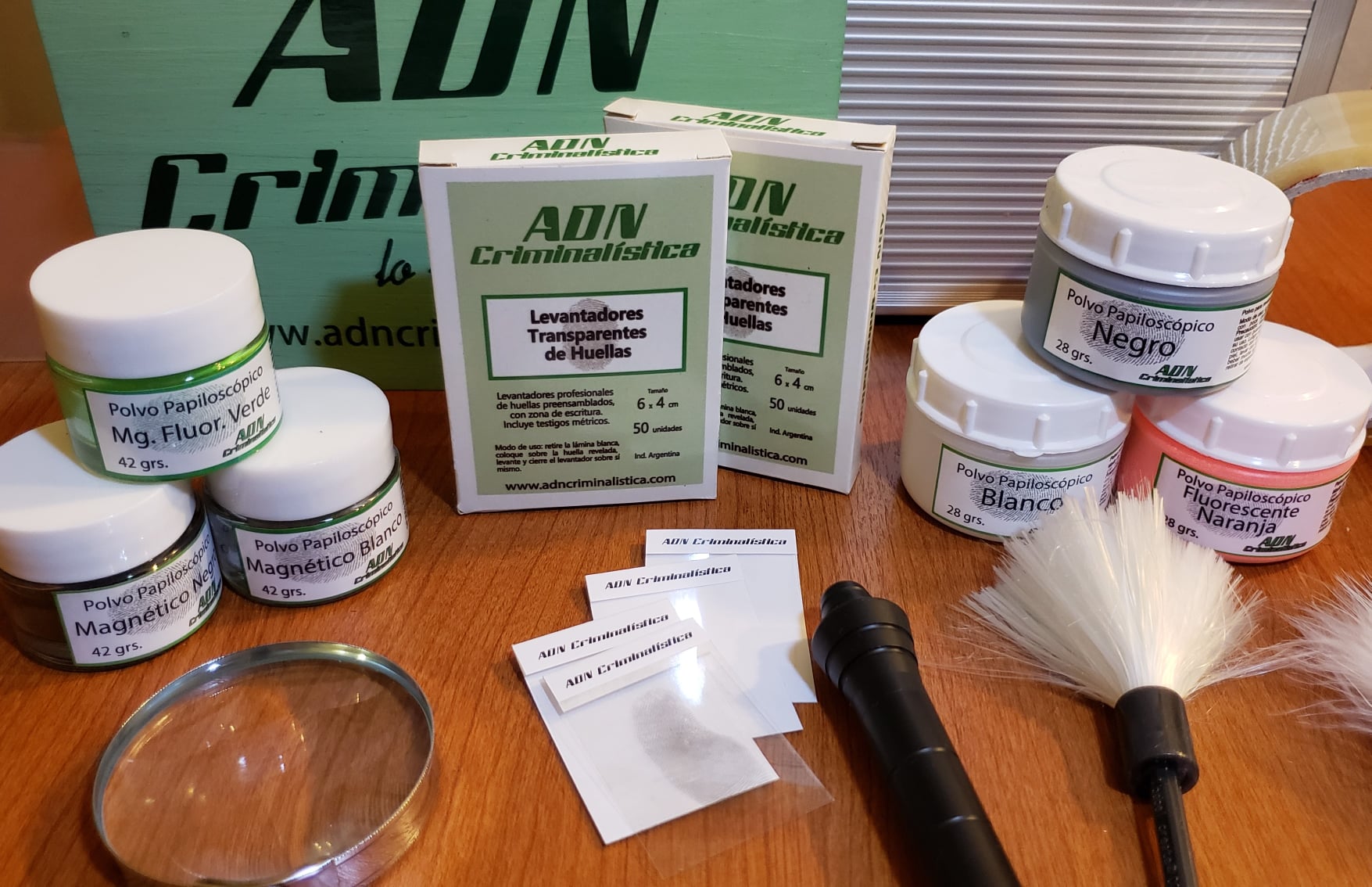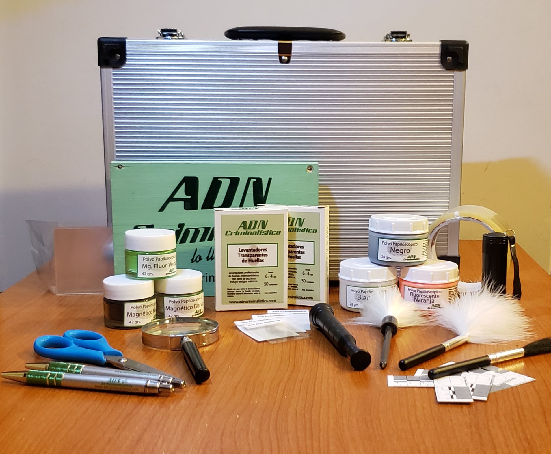 Nuevo maletín especializado para revelado y levantamiento de rastros papiloscópicos latentes. Todos sus elementos se entregan en maletín de aluminio reforzado tamaño mediano, protegido por espuma de polietileno en ambas caras.