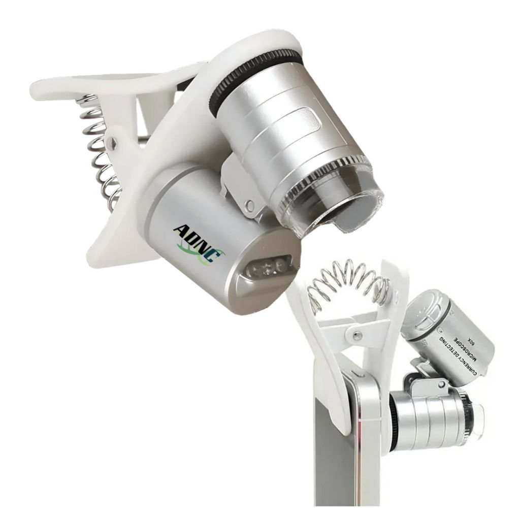 Microscopio 60x portátil de bolsillo con iluminación LED blanca y UV (para detección de medidas de seguridad documentales) y con clip desmontable para poder ser usado también tanto en la cámara del celular como en tablets, y así documentar las imágenes visualizadas.
